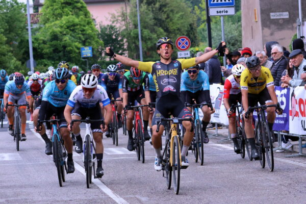 Il portacolori della Hopplà Petroli Firenze precede allo sprint Cristian Rocchetta (Trevigiani) e Simone Buda (Solme Olmo) nella la 45° edizione del Gran Premio San Bernardino.