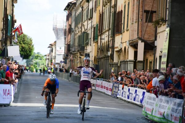 San Giovanni Valdarno, 28 maggio 2024 – Due atleti esperti della categoria dilettanti élite, Tommaso Rigatti e Andrea Colnaghi, si sono contesi il successo su Corso Italia nel centro storico di San Giovanni Valdarno con arrivo posto di fronte allo splendido Palazzo d’Arnolfo. Ha prevalso Rigatti della Sissio Team anche se ha iniziato a festeggiare la vittoria anche troppo presto consentendo a Colnaghi di avvicinarlo, e per il futuro meglio evitare di alzare le braccia prima del dovuto. Alla sua felicità per la meritata vittoria si aggiunge il trionfo della Maltinti Banca Cambiano di Empoli in quanto la gara valdarnese allestita dalla Fracor International e dal Comitato Organizzatore presieduto da Mauro Cuccoli, era valevole per i due titoli toscani 2024 che sono andati all’under 23 Pietro Salvadori (quinto all’arrivo) ed all’èlite Matteo Niccoli, giunto undicesimo e primo tra gli atleti con residenza in Toscana. Un doppio successo (e Niccoli ricordiamo vinse un mese fa anche il campionato toscano a cronometro in montagna) festeggiato dai direttori sportivi presenti in Valdarno, Tiziano Antonini, Alfredo Luddi e Corrado Scali, oltreché dal presidente Roberto Maltinti. L’edizione di quest’anno del Campionato Toscano era il 94° della serie, il primo fu nel 1926 a Siena e vinse Raffaele Di Paco. La corsa ha visto al via 137 atleti dei 190 iscritti (francamente troppe le defezioni) con tre giri comprendenti la salita de La Montanina-Meleto e 5 giri più brevi con il “muro” di Casacce ed un tratto al 18 per cento. Dopo una fuga di Regnanti e Veneri nella prima parte della corsa durata 60 km, nasceva a trenta dall’arrivo l’episodio decisivo protagonisti Colnaghi, Rigatti e Belloni. L’accordo era buono il gruppo perdeva fino a 1’40 frazionandosi alle spalle dei fuggitivi, ma non in grado di riprenderli. Mollava Belloni, mentre Colnaghi e Rigatti erano avvicinati dagli scatenati Sasso e Parravano usciti alla caccia del tandem di testa a 10 km dall’arrivo. L’inseguimento però non riusciva e la volata vedeva protagonisti Colnaghi e Rigatti con il successo del corridore guidato da Marco Toffali. Alle spalle dei due, Parravano e Sissio entrambi in ottima condizione come hanno dimostrato con la “sparata” finale, mentre Salvadori vinceva la volata di un ristretto plotoncino e il quinto posto gli permetteva di vestire la maglia di Campione Toscano. Presenti alla gara il sindaco di San Giovanni Valdarno, Valentina Vadi, l’assessore allo sport Nadia Garuglieri, il comandante della Polizia Municipale Mauro Cottoni, il presidente della Pro Loco Massimo Pellegrini e i dirigenti del ciclismo Renzoni, Gigli, Farulli, Dolfi. Una bella corsa nessun incidente da segnalare, ed encomiabile il lavoro del Comitato sangiovannese.