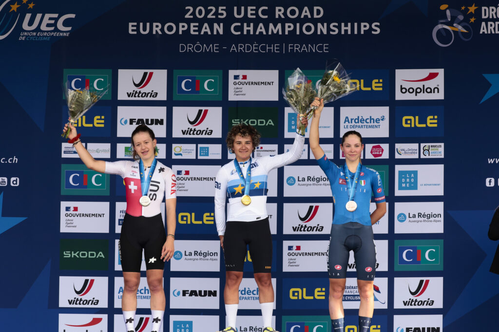 DONNE JUNIOR – La categoria conosce tre dominatrici e una regina indiscussa, la spagnola Paula Ostiz Taco, che vince il titolo europeo anche nella prova in linea dopo quello a cronometro oltre al mondiale in Ruanda Supera allo sprint la svizzera Anja Grossmann, con la quale si è avvantaggiata a pochi chilometri dalla conclusione. Sul terzo gradino del podio, ed è la quinta medaglia per l’Italia, Chantal Pegolo. Il podio del Campionato europeo di categoria, quindi, ripropone le stesse protagoniste del mondiale, con posizioni invertite tra l’azzurra e la ciclista elvetica.