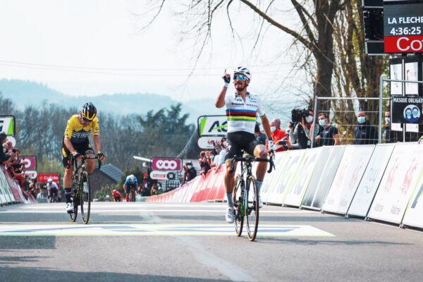 Mur De Huy (BEL) – Julian Alaphilippe (Deceuninck – Quick-Step) per la terza volta in carriera vince la Freccia Vallone. Forse la più bella, perché ottenuta con la maglia di campione del mondo sulle spalle e perché arrivata in rimonta negli ultimi metri del Mur de Huym superando Primož Roglic (Jumbo-Visma), per un finale palpitante. Terzo posto per l’eterno Alejandro Valverde (Movistar Team).