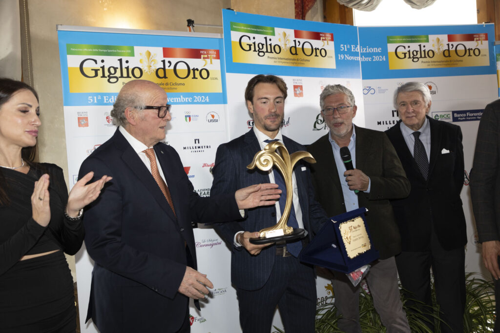 E’ un corridore – dice Reverberi – sul quale possiamo fare affidamento, per le doti e qualità che possiede”. Un premio doveroso alle due splendide olimpioniche della pista alle Olimpiadi di Parigi, la toscana Vittoria Guazzini e la bergamasca Chiara Consonni. Tra i campioni del passato riconoscimenti al fiorentino Francesco Casagrande (Premio Franco Ballerini) che da qualche mese allena i giovani, e quello alla carriera per Vincenzo Nibali. Premi ai colleghi Francesco Pancani e Marco Pastonesi (nel ricordo della penna del ciclismo Franco Calamai), al Commissario Internazionale Francesca Mannori (premio Gino Bartali) presidente di giuria alle Olimpiadi di Parigi, a Marco Calamai (Premio Alfredo Martini maestri dello sport) quale allenatore di basket dei ragazzi diversamente abili dopo aver giocato nel basket e allenato in A1. Infine premiati anche l’azzurro Enea Sambinello, miglior juniores toscano della stagione, il bravissimo c.t. della pista Marco Villa, Giuseppe figlio di Joe Barone, indimenticabile direttore generale della Fiorentina Calcio. Tra i tanti ospiti Francesco Moser, Mara Mosole, Marina Romoli, il c.t. azzurro Under 23 Marino Amadori, Nicola Armentano assessore allo sport della Città Metropolitana di Firenze, i dirigenti del ciclismo Saverio Metti e Leonardo Gigli. Al 51° Giglio D’Oro non è mancato veramente nulla, tra tanti applausi e complimenti.