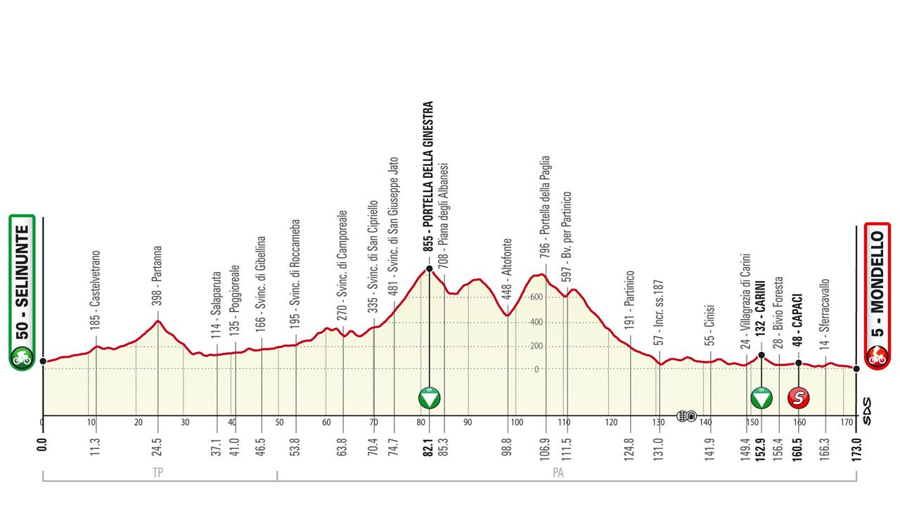 Tappa caratterizzata da una serie di ondulazioni “facili” nella prima parte. Si scala poi Portella della Ginestra con una serie di salite e discese di un certo impegno fino a raggiungere la costa dopo Partinico. Iniziano quindi gli ultimi 30 km dove si affronta il breve, ma intenso GPM di Carini e le successive parti di avvicinamento a Palermo.