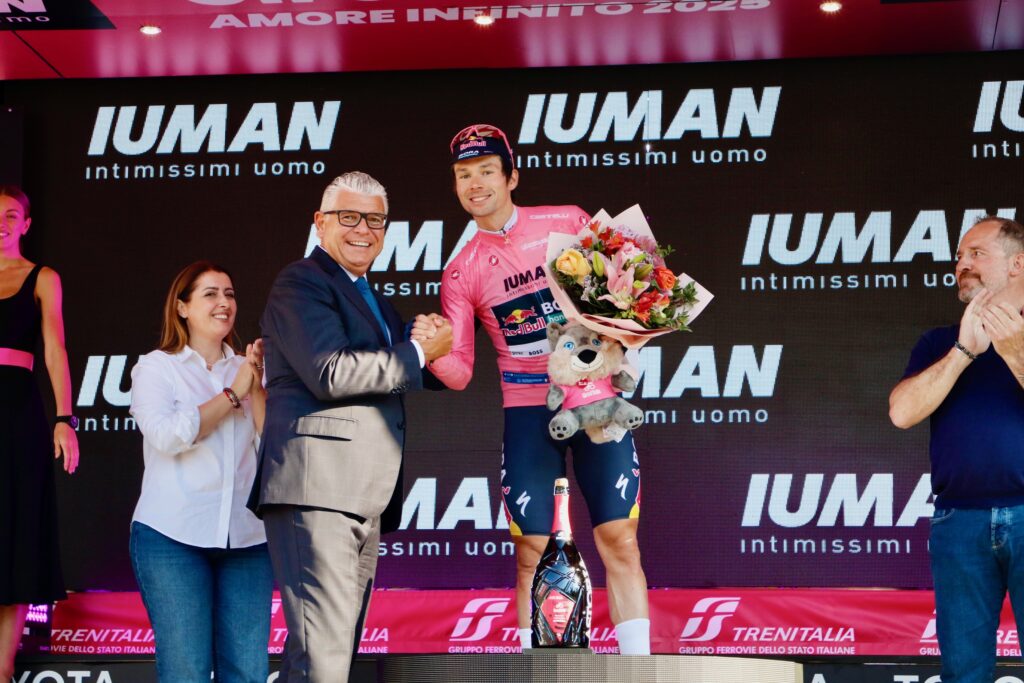 Maglia Rosa, leader della Classifica Generale, sponsorizzata da IUMAN – Intimissimi Uomo – Primož Roglič (Red Bull – Bora – Hansgrohe)