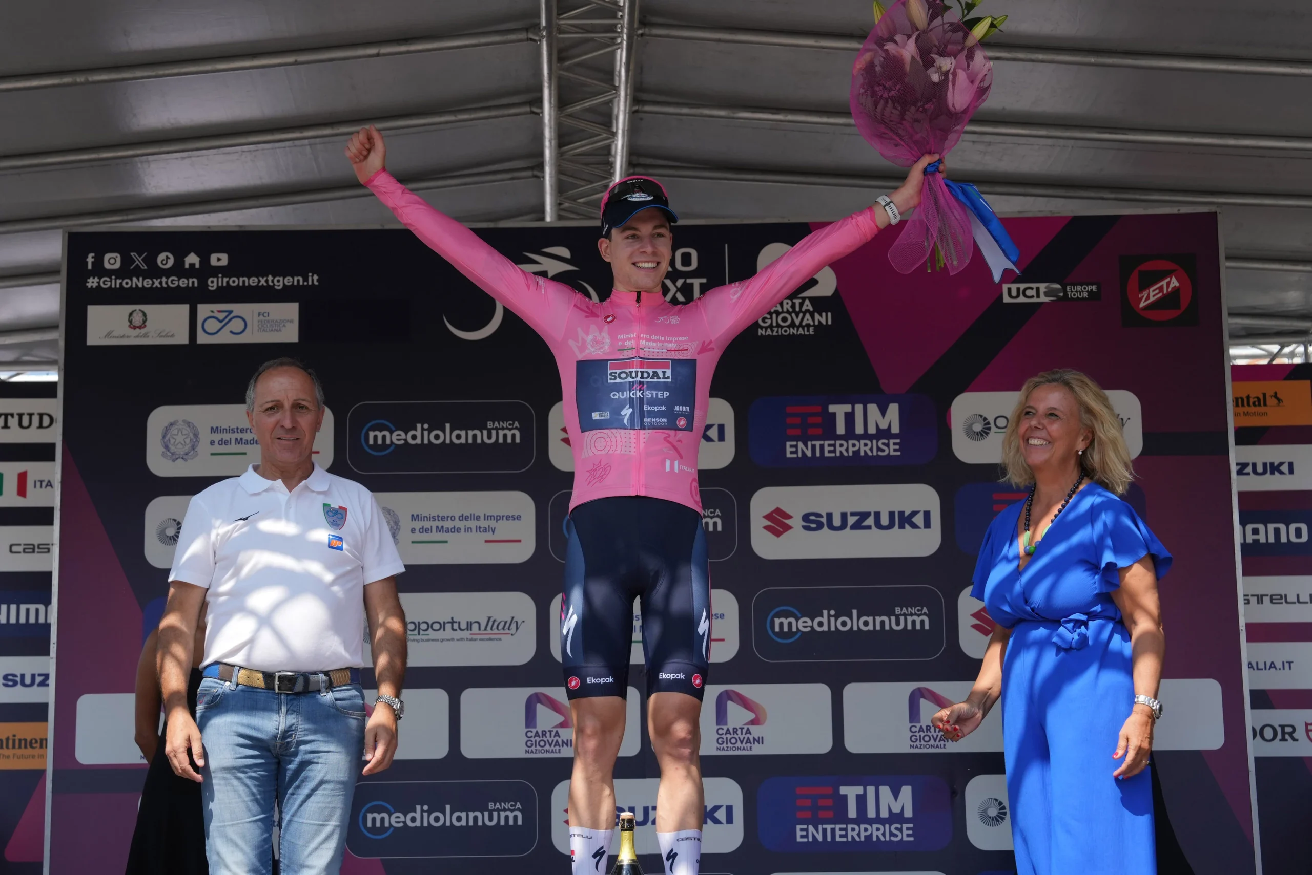 Maglia Rosa, leader della Classifica Generale, sponsorizzata da Mimit – Ministero delle Imprese e del Made in Italy – Jonathan Vervenne (Soudal Quick-Step Devo Team)