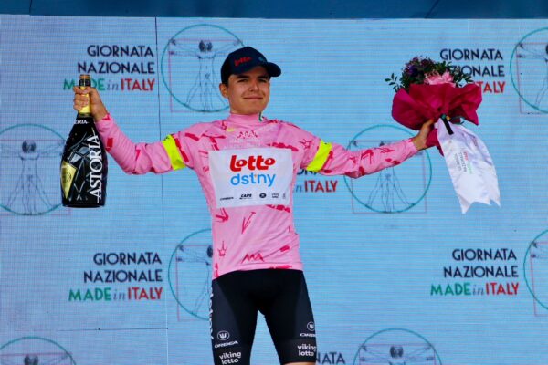 Maglia Rosa, leader della Classifica Generale, sponsorizzata da Mimit – Ministero delle Imprese e del Made in Italy – Jarno Widar (Lotto Dstny Development Team)