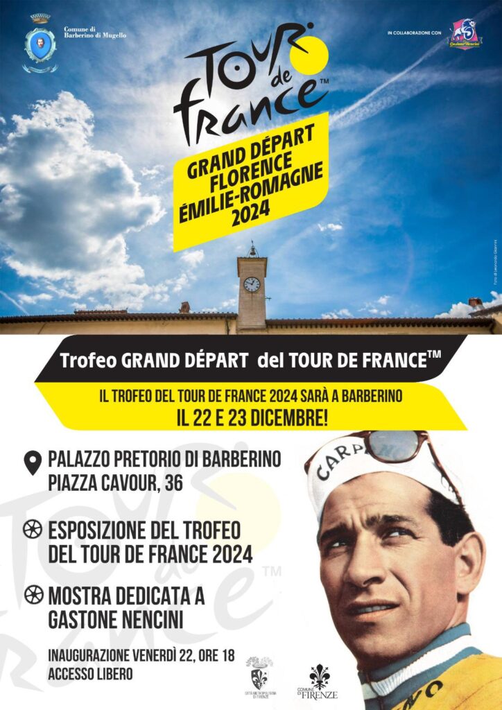 BARBERINO DI MUGELLO – Il Trofeo Grand Dèpart del Tour de France arriva in Mugello, nella terra di Gastone Nencini, uno dei campioni che tra le sue vittorie in una carriera splendida, può vantare anche quella ottenuta nella Grande Boucle nel 1960. Una tappa per il Trofeo dunque particolare e speciale, che vivrà il suo momento d’inaugurazione nel Palazzo Pretorio di Piazza Cavour a Barberino, nel pomeriggio di venerdì 22 dicembre con inizio della cerimonia previsto alle ore 18. Negli stessi locali in contemporanea e grazie all’Amministrazione Comunale, verrà inaugurata anche la mostra dedicata a Gastone Nencini, con splendide foto in bianco e nero della sua straordinaria carriera. Sarà presente la figlia del campione mugellano di Bilancino, Elisabetta Nencini, oltre a varie autorità e dirigenti del ciclismo toscano.