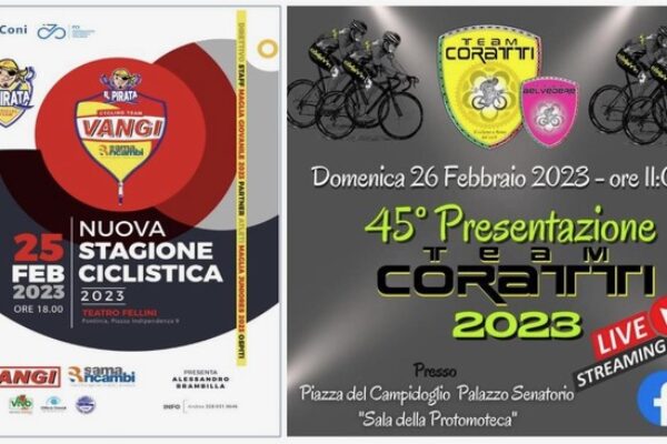 Weekend di presentazioni quello in arrivo per una coppia di storiche società del Lazio. A svelare i roster della stagione 2023 saranno due delle formazioni più attese nel panorama ciclistico regionale. Aprirà il Pirata Vangi Sama Ricambi Sabato 25 Febbraio a Pontinia alle ore 18. Location dell’evento il Teatro Fellini dove converranno gli ospiti del team di Andrea Campagnaro. Sul palco sfileranno tutte le squadre della stagione 2023 con i rispettivi diesse. A presentare i ragazzi delle categorie Giovanissimi, Esordienti, Allievi e Juniores ci sarà il noto speaker sportivo Alessandro Brambilla. Top secret la coreografia della cerimonia che è stata sempre curata con grande attenzione dal vulcanico Andrea Campagnaro.