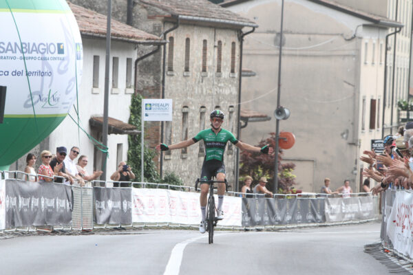 Il corridore friulano guadagna rapidamente 30”, mentre alle sue spalle il gruppo si ricompatta, e anche sul secondo e ultimo passaggio sul Combai riesce a gestire bene le energie. Da dietro diversi corridori provano a sganciarsi, ma Montagner è imprendibile e ha tutto il tempo per godersi il trionfale ultimo chilometro. Alle sue spalle arriva un gruppetto di 16 corridori a giocarsi la piazza d’onore, con Filippo Quintavalla (Nial Nizzoli Almo) che anticipa nettamente l’argentino Mateo Duque Cano (Gottardo Giochi Caneva).