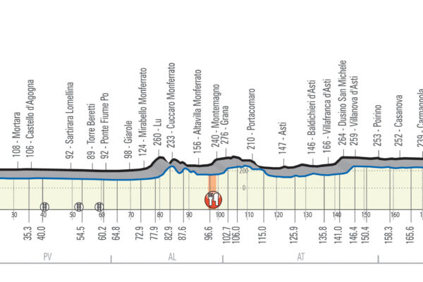 IL PERCORSO – Il percorso è sostanzialmente pianeggiante fatto salvo l’attraversamento del Monferrato dove si affronterà un breve serie di strappetti. Partenza da Mesero e attraversamento di Magenta per proseguire lungo la Pianura Padana su strade larghe e rettilinee. Si incontrano, oltre ai consueti ostacoli cittadini come rotatorie, spartitraffico e passaggi rialzati, quattro passaggi a livello tutti concentrati nei primi 60 km. Dopo l’attraversamento del Po nei pressi di Valenza si percorrono le ondulazioni del Monferrato che si concludono con l’attraversamento di Asti. Ultimi 70 km praticamente pianeggianti fino all’arrivo di Stupinigi.