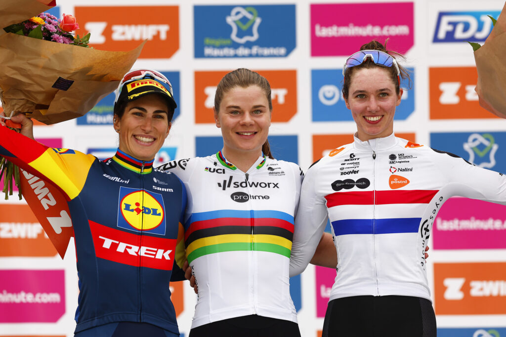LA GARA – Diverse le cadute hanno caratterizzato la prima parte di gara. Fin dal primo tratto di pavè, quello di Hornaing à Wandignies, Lotte Kopecky ha fatto capire di voler fare la differenza, marcata stretta dalla Lidl Trek e dalla dsm-firmenich PostNL A poco più di trenta chilometri dal traguardo la Fdj Suez ha giocato la carta Jade Wiel. Annullata l'azione, ci hanno provato Ellen van Dijk (Lidl – Trek) e Amber Kraak (FDJ – SUEZ) raggiunte poco dopo da Balsamo (Lidl – Trek), Vos (Team Visma | Lease a Bike) e Kopecky (Team SD Worx – Protime).