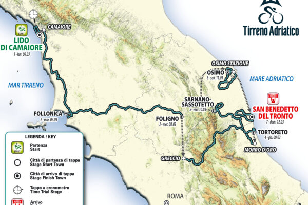 Come nel 2022, anche la 58^ edizione della Tirreno-Adriatico si aprirà con una cronometro individuale sulle strade di Lido di Camaiore. Gli 11.5 km in programma rappresenteranno un primo test per i pretendenti alla Maglia Azzurra mentre le due frazioni successive, la Camaiore-Follonica e la Follonica-Foligno, offriranno due occasioni importanti ai velocisti. Dall’Umbria si scenderà nel Lazio con la Greccio-Tortoreto per una frazione da oltre 2000 metri di dislivello con un circuito finale di 17 km da ripetere tre volte molto insidioso. Gli ultimi 3 km verso Tortoreto sono in salita al 7%. Venerdì 10 marzo la quinta tappa, che prenderà il via da Morro d’Oro, proporrà l’arrivo in salita della Corsa dei Due Mari, un finale inedito in quanto per la prima volta si arriverà fino ai 1465 metri di Sarnano-Sassotetto, un prolungamento di 2 km rispetto alle edizioni in cui la corsa aveva scalato l’ascesa marchigiana. Prima del classico finale con una frazione in linea a San Benedetto del Tronto, sabato 11 marzo ci sarà l’ormai classica tappa dei Muri Marchigiani da Osimo Stazione a Osimo. Il circuito finale presenta tratti con pendenze superiori ai 20% per una frazione da 3000 metri di dislivello.