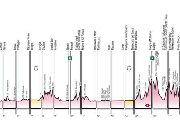 Ancora una volata nella Riccione-Cento (179 km) che attraversa le zone martoriate dall’alluvione del maggio 2023. Fine settimana con due tappe molto impegnative: Castiglione delle Stiviere-Desenzano del Garda: cronometro individuale (31.0 km) e Manerba del Garda-Livigno (Mottolino) di 223 km con arrivo in salita inedito. La cronometro è l’ultima occasione per gli specialisti per accumulare vantaggio sugli scalatori, ma già il giorno successivo questi ultimi avranno l’occasione se non di ribaltare la situazione almeno di rosicchiare secondi, o minuti, agli avversari. La crono è piatta e velocissima, laddove nel 1859 fu combattuta la seconda guerra di indipendenza. Per arrivare a Livigno si supereranno 5200 m di dislivello con nel finale l’interminabile Forcola di Livigno (sconfinamento in Svizzera) e l’arrivo al Mottolino dove gli ultimi 1800 m percorrono su asfalto una pista di sci con un’alternanza di rampe al 18% e brevi tratti quasi piatti.