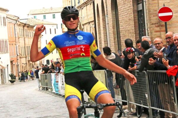 SARNANO/RECANATI – Com’è nelle sue tradizioni, l’Associazione Ciclistica Recanati ha riservato alla Sarnano-Recanati una splendida giornata spalancando le porte al futuro dei ragazzi della categoria allievi che si sono cimentati in questa nobile classica del ciclismo marchigiano e non solo. Una macchina organizzativa ben oliata per la 34°volta e il solito tracciato abbastanza ondulato che ha unito in 94 chilometri Sarnano e Recanati. Sulla linea di partenza 82 corridori, la pioggia ha accompagnato la corsa nei primi 25 chilometri, successivamente i traguardi intermedi in località Maestà e Sambucheto sono andati a Simone Sasso del Pedale Chiaravallese e a Christian Scarpelli della SC Cotignolese, bene anche Francesco Bucci della Gulp Pool Val Vibrata al transito nel gran premio della montagna posto in via Beato Placido al primo passaggio a Recanati con il gruppo dei migliori che si è assottigliato a una quarantina di unità. Il bravo atleta romagnolo Luca Signorini del Pedale Azzurro Rinascita gli applausi se li è meritati e come con la sua decisa progressione nel finale in un tratto di pianura, tenendo in salita fino a vedere il traguardo da vincitore assoluto mettendosi alle spalle l’abruzzese Mattia Persiani della Gulp Pool Val Vibrata (secondo a 22” in solitaria). Ancora più dietro Alessandro Battistoni della Civitanova Bike Academy (recente vincitore del Memorial Armando Pierini) che ha colto la terza piazza nel gruppo degli inseguitori (distacco 52” dal vincitore) in cui figuravano anche Alessandro Pellegrini (Team Go Fast), Matteo Ranieri (SC Cotignolese), Stefano Cavalli (Velo Club Cattolica), Michele Pio Cacchio (Polisportiva Fiumicinese FAIT Adriatica), Luca Spendolini (Pedale Chiaravallese), Luca Cerisola (Effetto Ciclismo – Noi Sport) e Giulio Biancalana (Velo Club Racing Assisi Bastia) entro il decimo posto. Con la Sarnano-Recanati si è chiuso il sipario sulla combinata del Poker Leopardiano (che raggruppa tutte le corse organizzate dalle squadre ciclistiche recanatesi) ad appannaggio di Persiani (17 punti), secondo Pellegrini (13) e terzo Luca Fabbri della Polisportiva Fiumicinese FAIT Adriatica (12).