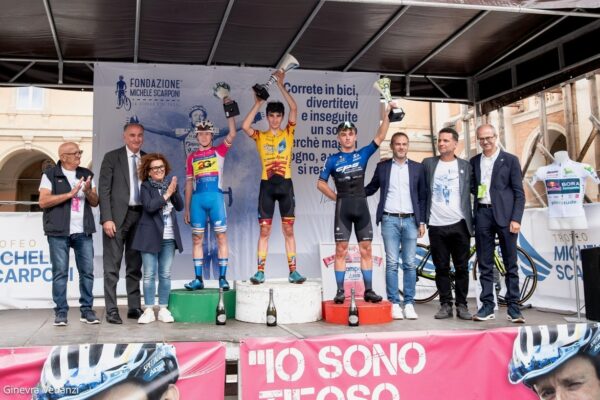 La cerimonia di premiazione, condotta dallo speaker Fabrizio Amadio, ha regalato momenti di grande emozione e riconoscimento per tutti i protagonisti della giornata. Si sono succeduti Massimo Romanelli (Presidente del Comitato Regionale FCI Marche), Fabio Luna (Presidente del CONI Marche) e Lino Secchi (Presidente Onorario della Federciclismo Marche) così come i due Sindaci dei comuni di partenza e di arrivo Patrizio Leonelli (Castelraimondo) e Roberto Lucarelli (Camerino). A rendere ancora più intensa la cerimonia, la presenza della famiglia Scarponi con i genitori Flavia e Giacomo.