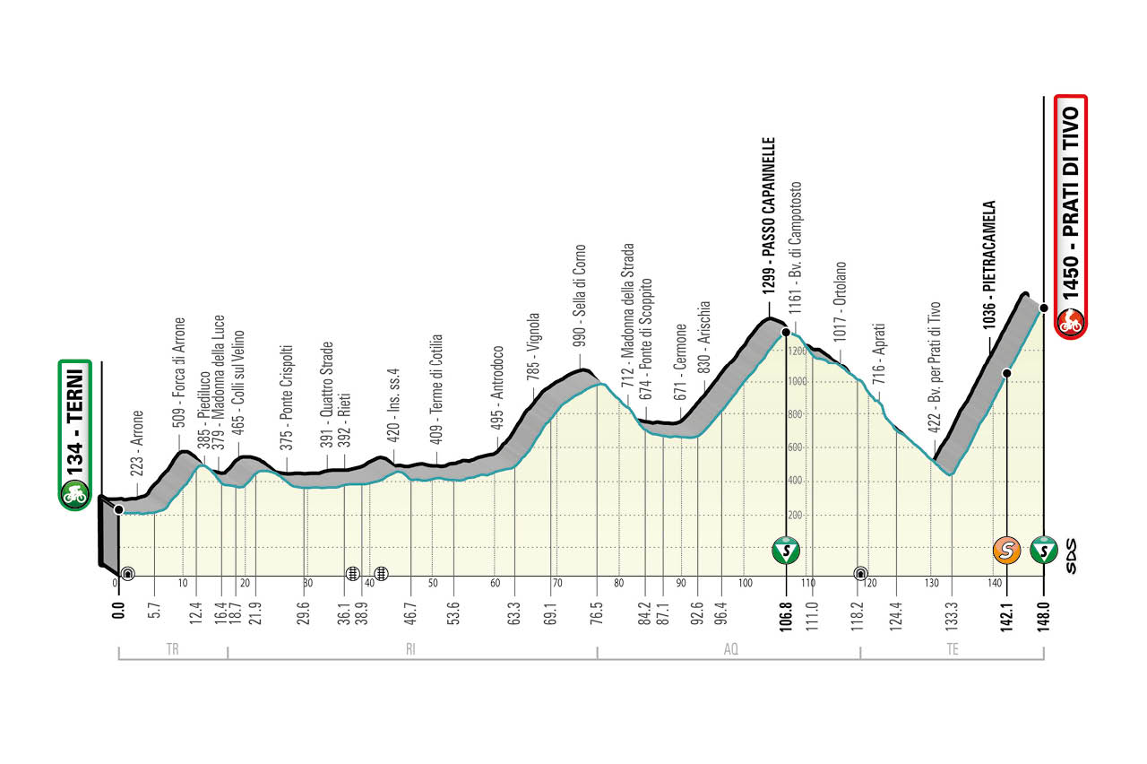 È la tappa regina della Corsa dei Due Mari che misura soltanto 148 chilometri. Dopo la partenza da Terni (in Umbria) e il passaggio per un breve tratto nel Lazio a Rieti e provincia, nella seconda parte si affrontano tre salite in un crescendo di difficoltà: Sella di Corno (990 metri) con sconfinamento in Abruzzo nella provincia di L’Aquila, lo scollinamento al Passo delle Capannelle (1299 metri, transito valevole come gran premio della montagna) per entrare nel territorio provinciale teramano con passaggio a Pietracamela (traguardo volante) e arrivo fino ai 1450 metri di Prati di Tivo (14 chilometri al 7% di media con punte al 12%) con arrivo dei primi corridori previsto tra le 16:00 e le 16:30 a Piazzale Amorocchi.