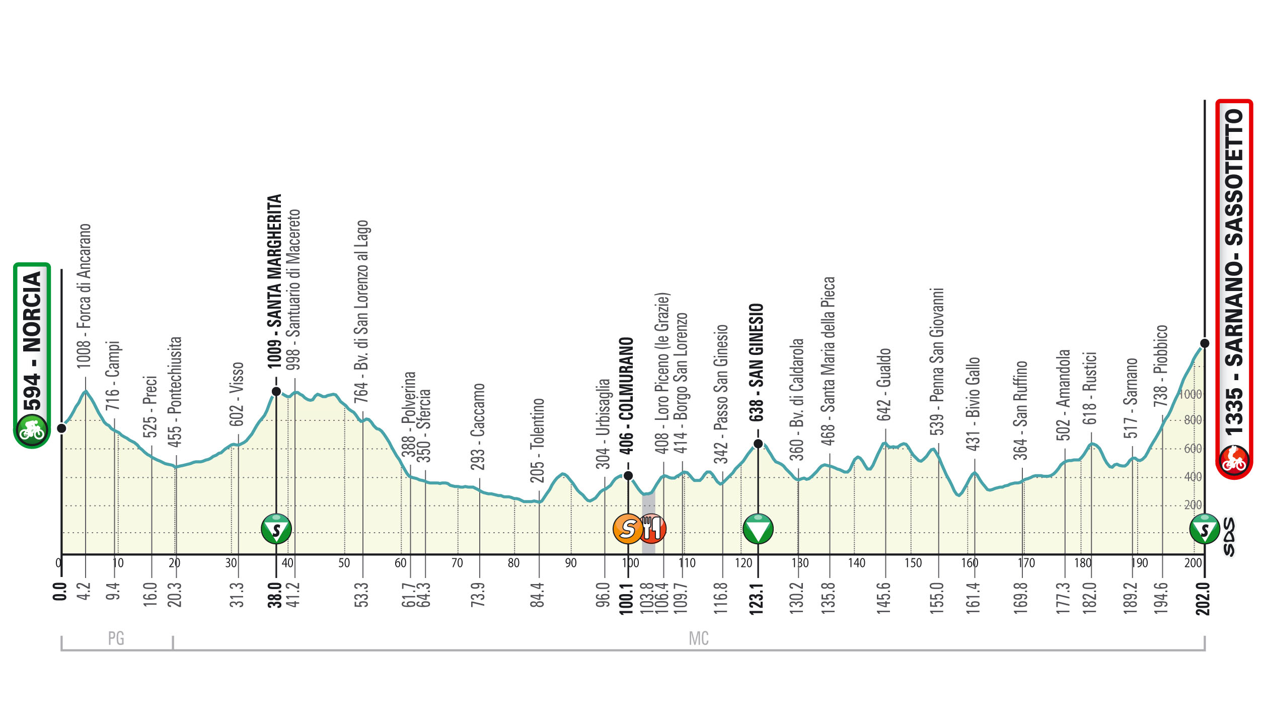Tappa molto impegnativa numerose salite di cui 3 classificate GPM. In partenza si scala la Forca di Ancarano (non classificata GPM) per entrare nei monti Sibillini. Dopo Visso si sale al Santuario di Macereto preceduto dallo scollinamento di Santa Margherita. Raggiunta Polverina inizia una sequenza di salite e discese che non ha attimi di respiro e/o pianura fino all’arrivo. Si scalano tra le altre le salite di San Ginesio, Gualdo e Penna San Giovanni. Il tracciato si presenta estremamente articolato sia altimetricamente che planimetricamente. Si svolge prevalentemente su strade con fondo da buono a leggermente usurato e dalla carreggiata di media dimensione. Salita finale al Sassotetto da Sarnano di 14.2 km al 5.8% di media e con massime fino al 12%.