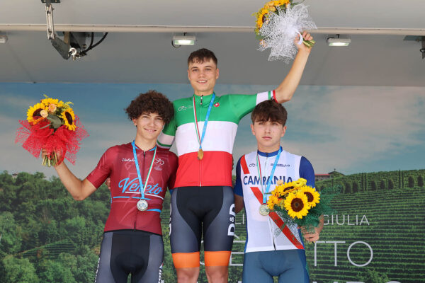 Trieste, 22 giugno 2025 – La prova regina dei Campionati Italiani Juniores di ciclismo su strada che si sono corsi sulle strade di Trieste in questo fine settimana con la regia organizzativa della Sc Cottur ha premiato il laziale Vincenzo Carosi. Il ragazzo di Vetralla (Vt), classe 2008, è riuscito a sorprendere tutti regolando il drappello dei migliori di giornata sul rettifilo d’arrivo del Porto Vecchio. Sul secondo gradino del podio è salito il veneto Patrik Pezzo Rosola mentre la medaglia di bronzo ha sorriso al campano Michele Pascarella.