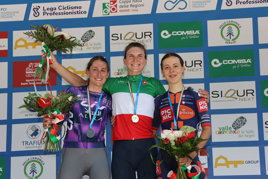 DARFO BOARIO TERME (BS) – Elisa Longo Borghini si riconferma campionessa italiana delle Donne Elite. L’atleta della UAE Team ADQ allunga con Monica Trinca Colonel e Eleonora Ciabocco, in seguito scattando al primo passaggio sullo strappo di Via Cornaleto, a circa 30 km dal traguardo.. Inizia così la sua cavalcata trionfale in solitaria verso la conquista del tricolore.