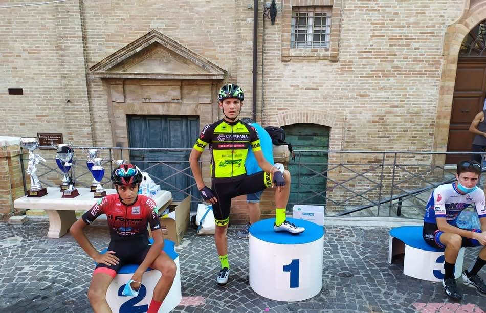Nell’estate ciclistica post lockdown, a Petritoli è arrivato il grande giorno per Federico Iacomoni (Campana Imballaggi) che ha potuto esultare per la vittoria in occasione del Trofeo Balacco-Paponi con Raffaele Mosca (Forno Pioppi) e Ludovico Crescioli (Casano) finiti sul podio della classica juniores della Valdaso e organizzata dal Team Studio Moda insieme al comitato organizzatore in loco presieduto da Emanuele Senzacqua.