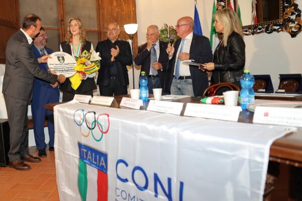 Signa, 23 ottobre 2024 – Grande festa per l’olimpionica su pista di Parigi, la ventitreenne poggese Vittoria Guazzini nella bella cornice di Villa Alberti a Signa, dove la locale Sezione Azzurri Fulvio Nesti – Egisto Pandolfini – Le Signe dell’Unione Nazionale Veterani dello Sport, ha consegnato all’atleta di Poggio a Caiano il premio nazionale “Atleta dell’Anno”. La Guazzini accompagnata dai genitori, mamma Beatrice e padre David, è stata accolta al suono della filarmonica Giuseppe Verdi di Signa che ha suonato in suo onore l’inno nazionale che Vittoria nella sua carriera e sul gradino più alto del podio, ha ascoltato tante volte nella sua splendida carriera, avendo vinto in 8 anni la bellezza di 20 Medaglie d’Oro tra Campionati del Mondo ed Europei su strada e su pista, oltre a quella più prestigiosa conquistata alle ultime Olimpiadi di Parigi in coppia con Chiara Consonni nella prova del Madison. Oltre ai sindaci di Signa e Lastra a Signa, Giampiero Fossi ed Emanuele Caporaso, era presente anche l’assessore allo sport del comune di Poggio a Caiano, Piero Baroncelli, il presidente del CONI regionale Simone Cardullo con il delegato provinciale di Firenze, Gianni Taccetti, che è anche il presidente del Comitato del Premio, il Consigliere Regionale Fausto Merlotti, il presidente della sezione Unvs delle Signe, Leandro Becagli, il presidente del Comitato Regionale Toscana della Federciclismo Saverio Metti, e numerosi sportivi. Oltre a Vittoria Guazzini che tra qualche giorno andrà in vacanza per il meritato riposo dopo una stagione intensa e frenetica, per il ciclismo hanno ricevuto il premio nazionale “Ambasciatori UNVS” il giornalista Antonio Mannori, che da 54 anni racconta il ciclismo sui giornali, radio e televisioni, e Roberto Alessi, già appassionato sponsor nel mondo del pedale.