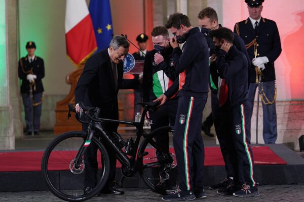 Gli atleti olimpici e paralimpici sono stati accolti prima al Quirinale, dove hanno riconsegnato il tricolore nelle mani del presidente, e poi a Palazzo Chigi – Consegnata al Premier una bici da corsa Pinarello e la maglia iridata appena conquistata da Ganna