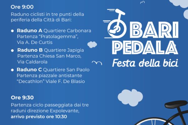 Domenica 23 aprile si riparte con la ciclopasseggiata. Alle 9 appuntamento con il raduno dei ciclisti in tre punti della periferia di Bari in direzione della Fiera del Levante, durante l’Expo Levante. Si parte dal quartiere Carbonara “Pratolagemma” in via A .De Curtis (A), dal quartiere Japigia dalla Chiesa San Marco in via Caldarola (B) e dal quartiere San Paolo dal piazzare “Decathlon”Viale F .De Blasio (C). I gruppi una volta che si incontreranno all’Expolevante pedaleranno nella zona Fesca-San Girolamo dalle ore 11. I partner sono Ance Bari e Bat e Puglia Village. Lo sponsor tecnico è Decathlon. “Il primo obiettivo di Bari Pedala – ha spiegato Pino Marzano della scuola Franco Ballerini – sarà sempre quello di includere le persone nel segno della mobilità sostenibile, che per noi rappresenta il futuro al quale devono guardare le nuove generazioni di cittadini. La bicicletta diventa quindi non certo un giocattolo, ma uno strumento essenziale di integrazione per giovani e non. Inoltre, vorrei ricordare il premio dedicato al compianto comandante Marzulli, uomo rigoroso e onesto, e le donazioni promosse dal rivenditore Cascella, grazie al quale doneremo materiale per la sicurezza sulla bici: giubbotti catarifrangenti, guanti e caschi, ai ragazzi degli istituti comprensivi Milani, Lombardi e Alberotanza. Sull’inclusività, vorrei ricordare che domenica la ciclopasseggiata si aprirà, per noi dal San Paolo, con le Hugbike, le biciclette degli abbracci destinate a persone con difficoltà motorie e di concentrazione”.
