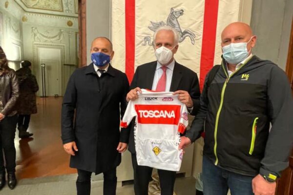 Novità per la maglia ufficiale della Toscana, che viene indossata dagli atleti e dalle atlete del ciclismo toscano quando fanno parte della rappresentativa regionale. Il debutto della nuova divisa domani domenica in due gare juniores, il Memorial Michael Antonelli in Romagna e nell’Eroica Juniores da Siena a Montalcino. La maglia presentata in Piazza Duomo a Firenze, presso la sede della Regione Toscana (presente il presidente Eugenio Giani), ha il logo relativo alla campagna sul rispetto della distanza di mt.1,5 quando si supera un ciclista. Erano presenti Saverio Metti presidente del Comitato Regionale Toscana di ciclismo e Marco Cavorso, delegato alla sicurezza dell’Associazione corridori professionisti italiani. Il logo è un segnale di sensibilizzazione per questa campagna sulla sicurezza per chi va in bici.