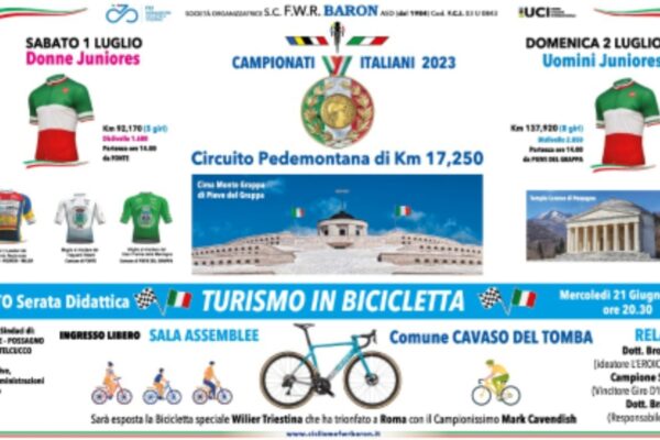 Cavaso del Tomba (Treviso) – I Campionati Italiani Juniores femminili e maschili su strada 2023, programmati rispettivamente sabato sabato 1 e domenica 2 luglio a Pieve del Grappa (Treviso), avranno un “gustoso antipasto” in occasione della Serata Didattica sul tema “Turismo in Bicicletta” organizzata per mercoledì 21 giugno nella Sala delle Assemblee del Comune di Cavaso del Tomba, in provincia di Treviso. L’incontro, con ingresso libero e preparato a partire dalle ore 20.30, è stato organizzato a 10 giorni dalle prove tricolori ed è stato messo a punto dalla Società Ciclistica F.W.R. Baron con la collaborazione del Comune di Cavaso del Tomba. La serata didattica avrà tra i suoi relatori il Dott. Giancarlo Brocci, ideatore de l’Eroica e delle Strade Bianche, Gilberto Simoni, vincitore, tra l’altro, dei Giri d’Italia 2001 e 2003 e il Dott. Diego Bragato, responsabile Performance della Federazione Ciclistica Italiana.