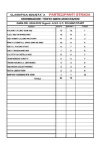 La ricca rassegna delle premiazioni, riservata anche ai migliori 5 corridori di ciascuna di manche, è stata inoltre inaugurata da una significativa sorpresa di matrice istituzionale. Il presidente della Federciclismo Cordiano Dagnoni è infatti intervenuto in collegamento telefonico per fare i propri auguri di buon inizio stagione a tutti i presenti e per rimarcare la centralità in ambito ciclistico dell’Umbria e della città Foligno, diventate in questi anni tappe fisse anche per eventi come il Giro d’Italia e la Tirreno-Adriatico. Il numero uno della FCI ha espresso così anche la propria stima e vicinanza nei confronti dell’UC Foligno e dell’UC Foligno Start. Due società che, attraverso l’assiduo impegno dei rispettivi presidenti Moreno Petrini e Mauro Angelucci, sono sempre state in prima linea nel coltivare il legame tra la città di Foligno e il mondo del pedale, facendo crescere tra le proprie fila anche dei talenti entrati oggi nel cuore degli appassionati come Giulio Pellizzari. Un’esperienza decennale di cui si percepisce la forte impronta anche in ambito organizzativo, come testimoniato dal successo del Trofeo Amoni Assicurazioni di sabato.