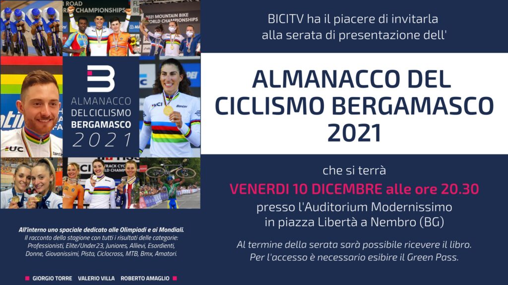 NEMBRO (BG) – Venerdì 10 dicembre alle ore 20,30 all’Auditorium Modernissimo di Nembro (Bg) si svolgerà la presentazione dell’Almanacco del Ciclismo Bergamasco 2021, l’iniziativa editoriale promossa da BICITV a cura di Giorgio Torre, Valerio Villa e Roberto Amaglio.