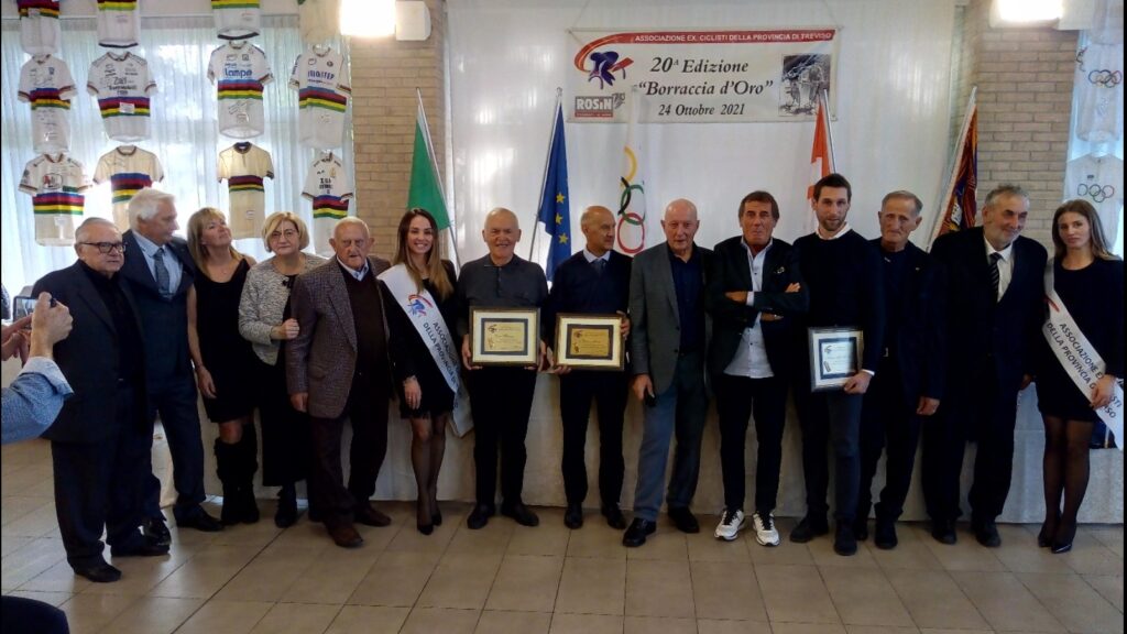 Mareno di Piave (Treviso) – Festa grande domenica 24 ottobre al Ristorante all'Oasi Campagnola di Mareno di Piave, in provincia di Treviso, per la 22° edizione del Convivio e la cerimonia di consegna del 20° Premio Borracce d'Oro Nazionali 2020 e 2021. La manifestazione, organizzata dall'Associazione Ex Ciclisti della Provincia di Treviso presieduta dall'irriducibile Cav. Uff. Germano Bisigato, da sempre rappresenta un importante appuntamento di fine anno destinato a quanti con il loro impegno hanno tenuto alti i colori del ciclismo della Marca. Quella di quest'anno è stata un'edizione del tutto particolare perché ha inteso consegnare i riconoscimenti destinati ai corridori dell'edizione 2020 (rinviata per l'emergenza Covid) e quindi a quelli di quest'anno. A Ricevere le Borracce d'Oro 2020 sono stati gli ex Renato Longo (assente per impegni di famiglia) e Luciano Loro; mentre quelle del 2021 le hanno ricevute Tiziano Dall'Antonia e Lino Farisato. A Longo sarà consegnato il riconoscimento in occasione del raduno di inizio anno.