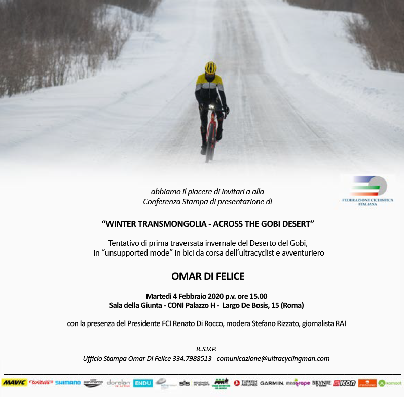Appuntamento domani alle 15.00 presso la Sala Giunta del CONI a Roma per la presentazione del “Winter Transmogolia – Across the Gobi Desert". Protagonista del primo tentativo di traversata invernale del Deserto dei Gobi (Mongolia) in bici da corsa sarà l'ultracyclist e avventuriero Omar Di Felice, che affronterà quest’avventura con il patrocinio della Federazione Ciclistica Italiana.