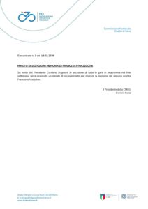 Su invito del Presidente Cordiano Dagnoni, in occasione di tutte le gare in programma nel fine settimana, verrà osservato un minuto di raccoglimento per onorare la memoria del giovane ciclista Francesco Mazzoleni.