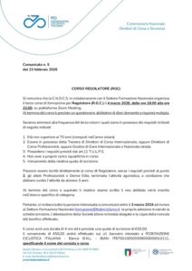 Si comunica che la C.N.D.C.S. in collaborazione con il Settore Formazione Nazionale organizza il terzo corso di formazione per Regolatore (R.G.C.) il 4 marzo 2026, dalle ore 18.00 alle ore 22.00, su piattaforma Zoom Meeting.