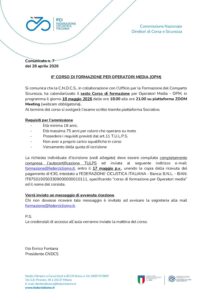 Si comunica che la C.N.D.C.S., in collaborazione con lβUfficio per la Formazione del Comparto Sicurezza, ha calendarizzato il sesto Corso di formazione per Operatori Media – OPM, in programma il giorno 18 maggio 2026 dalle ore 18.00 alle ore 21.00 su piattaforma ZOOM Meeting (webcam obbligatoria).