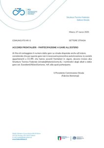 Al fine di conteggiare il numero delle gare su strada disputate anche all’estero, considerato che per queste gare non è necessaria preventiva autorizzazione, le società appartenenti a CC.RR. che hanno accordi frontalieri in vigore, devono inviare alla Struttura Tecnica Federale (strada@federciclismo.it), i nominativi degli atleti e delle gare cat. Esordienti/Allievi/Juniores, m/f, alle quali partecipano.