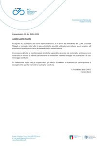 In seguito alla scomparsa del Santo Padre Francesco, e su invito del Presidente del CONI, Giovanni Malagò, si comunica che tutte le gare ciclistiche previste nella giornata odierna sono sospese, ad eccezione di quelle già in corso al momento della comunicazione.