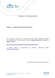 Con la presente si comunica che, è disponibile sul sito Federale l’aggiornamento delle Norme Attuative San 2025 riguardante i punti 1.2 Categorie Amatoriali e il punto 7.1 Attività di E-Bike.