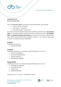 si è riunita per la verifica dell’ammissibilità delle candidature presentate entro il 19 novembre 2024 per l’Assemblea Elettiva Ordinaria Provinciale convocata per il giorno 29 novembre 2024 dal Comitato Provinciale FCI di Arezzo, per l’elezione di numero 3 in rappresentanza degli Affiliati all’Assemblea Elettiva Ordinaria Nazionale e per l’elezione degli organi provinciali – Quadriennio Olimpico 2025/2028.