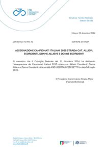 Si comunica che il Consiglio Federale del 21 dicembre 2024, ha deliberato l’assegnazione dei Campionati Italiani 2025 strada cat. Allievi, Esordienti, Donne Allieve e Donne Esordienti, alla società ASD LIBERTAS CERESETTO in data 5/6 luglio 2025.