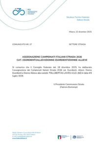 Si comunica che il Consiglio Federale del 18 dicembre 2025, ha deliberato l’assegnazione dei Campionati Italiani Strada 2026 cat. Esordienti, Allievi, Donne Esordienti e Donne Allieve alla società POL.LIBERTAS LAIVES A.S.D. (BZ) in data 4/5 luglio 2026.