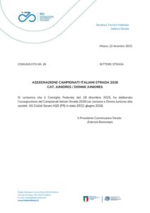 Si comunica che il Consiglio Federale del 18 dicembre 2025, ha deliberato l’assegnazione dei Campionati Italiani Strada 2026 cat. Juniores e Donne Juniores alla società AS Ciclisti Sorani ASD (FR) in data 20/21 giugno 2026.