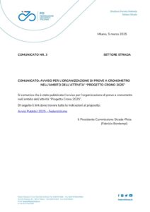 Si comunica che è stato pubblicato l’avviso per l’organizzazione di prove a cronometro nell’ambito dell’attività “Progetto Crono 2025”.