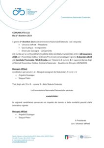 si è riunita per la verifica dell’ammissibilità delle candidature presentate entro il 29 novembre 2024 per l’Assemblea Elettiva Ordinaria Provinciale convocata per il giorno 9 dicembre 2024 dal Comitato Provinciale FCI di Brindisi, per l’elezione di numero 1 in rappresentanza degli Affiliati all’Assemblea Elettiva Ordinaria Nazionale – Quadriennio Olimpico 2025/2028.