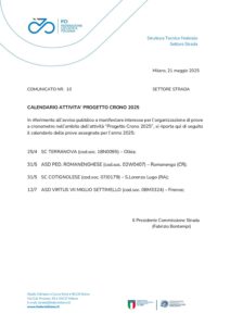 In riferimento all’avviso pubblico a manifestare interesse per l’organizzazione di prove a cronometro nell’ambito dell’attività “Progetto Crono 2025”, si riporta qui di seguito il calendario delle prove assegnate per l’anno 2025: