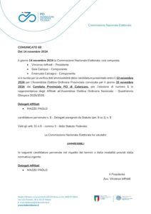 si è riunita per la verifica dell’ammissibilità delle candidature presentate entro il 13 novembre 2024 per l’Assemblea Elettiva Ordinaria Provinciale convocata per il giorno 23 novembre 2024 dal Comitato Provinciale FCI di Catanzaro, per l’elezione di numero 1 in rappresentanza degli Affiliati all’Assemblea Elettiva Ordinaria Nazionale – Quadriennio Olimpico 2025/2028.