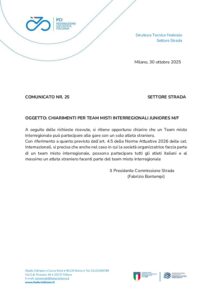 Con riferimento a quanto previsto dall’art. 4.5 delle Norme Attuative 2026 delle cat. Internazionali, si precisa che anche nel caso in cui la società organizzatrice faccia parte di un team misto interregionale, possono partecipare tutti gli atleti italiani e al massimo un atleta straniero facenti parte del team misto interregionale