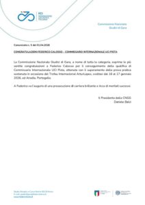 La Commissione Nazionale Giudici di Gara, a nome di tutta la categoria, esprime le piΓΉ sentite congratulazioni a Federico Calosso per il conseguimento della qualifica di Commissario Internazionale UCI Pista, ottenuta con il superamento della prova pratica sostenuta in occasione del Trofeu Internacional ArturLopes, svoltasi dal 16 al 17 gennaio 2026, ad Anadia, Portogallo.