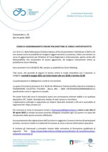 La C.N.D.C.S. della Federazione Ciclistica Italiana al fine di permettere l’attività per il 2025 a chi non avesse avuto la possibilità di svolgere l’aggiornamento in presenza, indice una tantum un corso di aggiornamento per Direttore di Corsa Regionale e Internazionale, aperto anche alle Motostaffette che necessitano di essere aggiornate, da svolgersi interamente online su piattaforma Zoom Meeting.