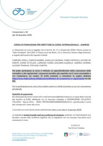 In riferimento al corso in oggetto che si terrà il 16, 17 e 18 gennaio 2026 a Roma, presso la “Sala Presidenti” del CONI, in Piazza Lauro de Bosis, 15, si comunica l’elenco degli ammessi, a seguito dell’esame dei requisiti richiesti: